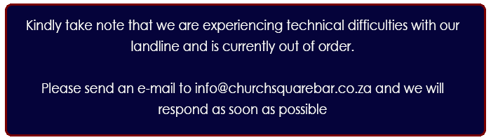 LOOKING TO JOIN US OR CONTACT US? Call us on +27 12 324 2587 or email info@churchsquarebar.co.za and let us help you. |